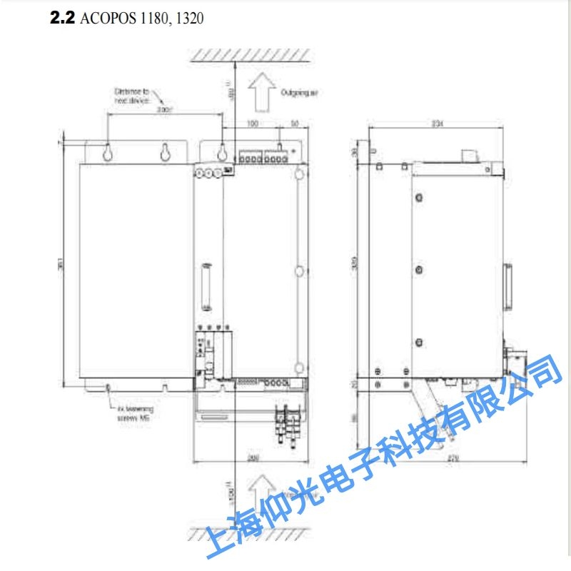 貝加萊ACOPOS1180/ACOPOS1320驅(qū)動器安裝要求-為了保證良好的空氣循環(huán) ACOPOS 伺服驅(qū)動的上下方必須各留至少 80mm空間 為了避免電纜問題在 ACOPOS 伺服驅(qū)動下方至少留出 100mm空間.